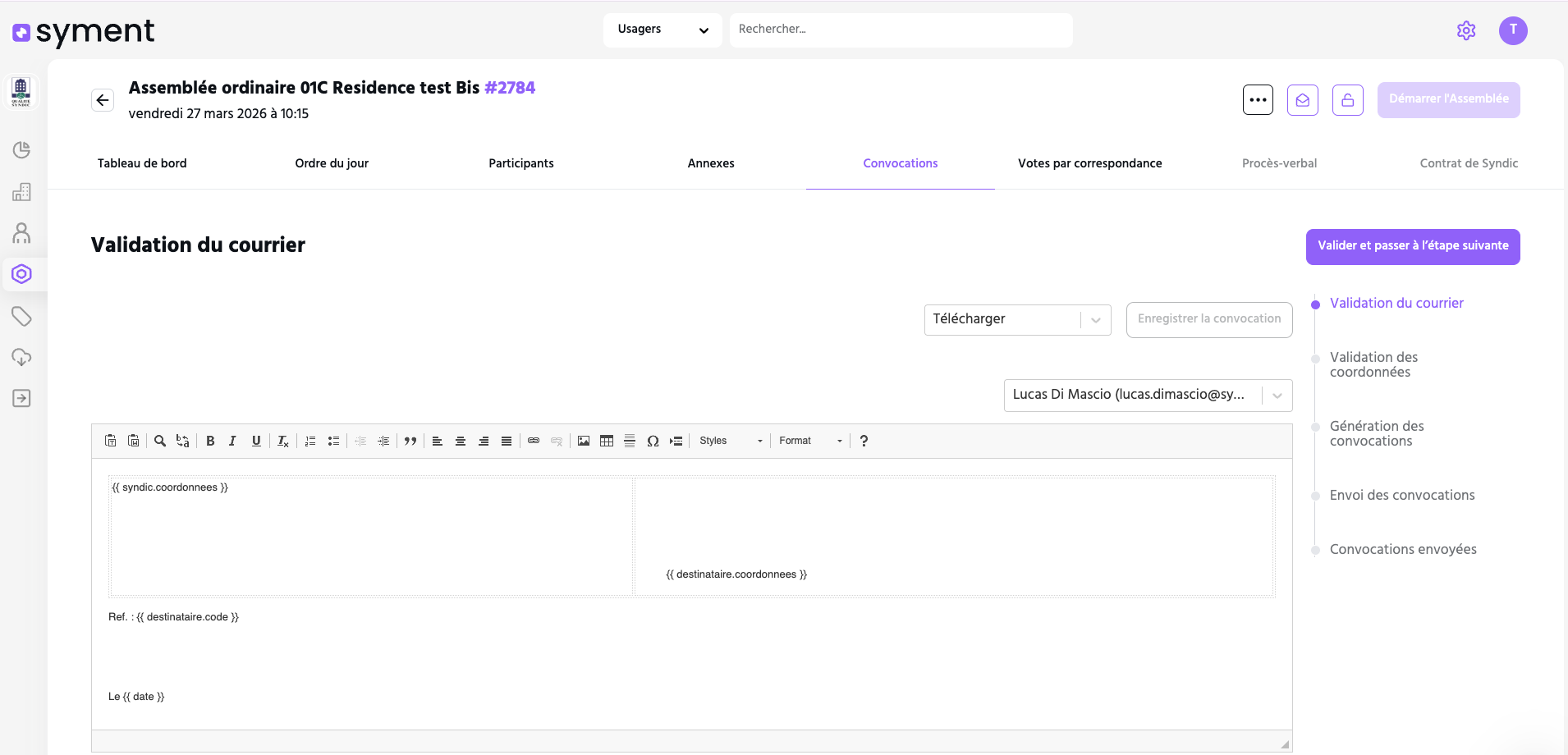 Choisissez l'adresse e-mail de contact qui s'affiche dans vos convocations et dans le formulaire de vote par correspondance. Idéal pour orienter les retours copropriétaires vers la bonne boîte mail selon le contexte.