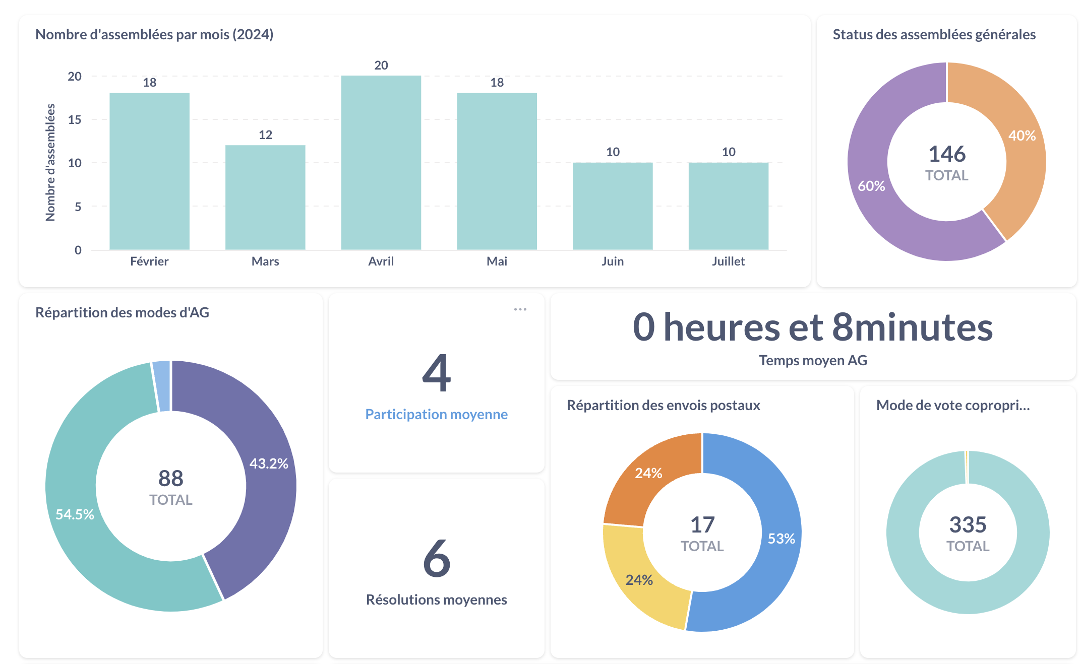 Nous avons mis Ă disposition de lâensemble de vos gestionnaires lâaccĂšs Ă des statistiques sur vos assemblĂ©es passĂ©es. Pour y accĂ©der rendez-vous dans âAssemblĂ©esâ > âStatistiques des assemblĂ©esâ.